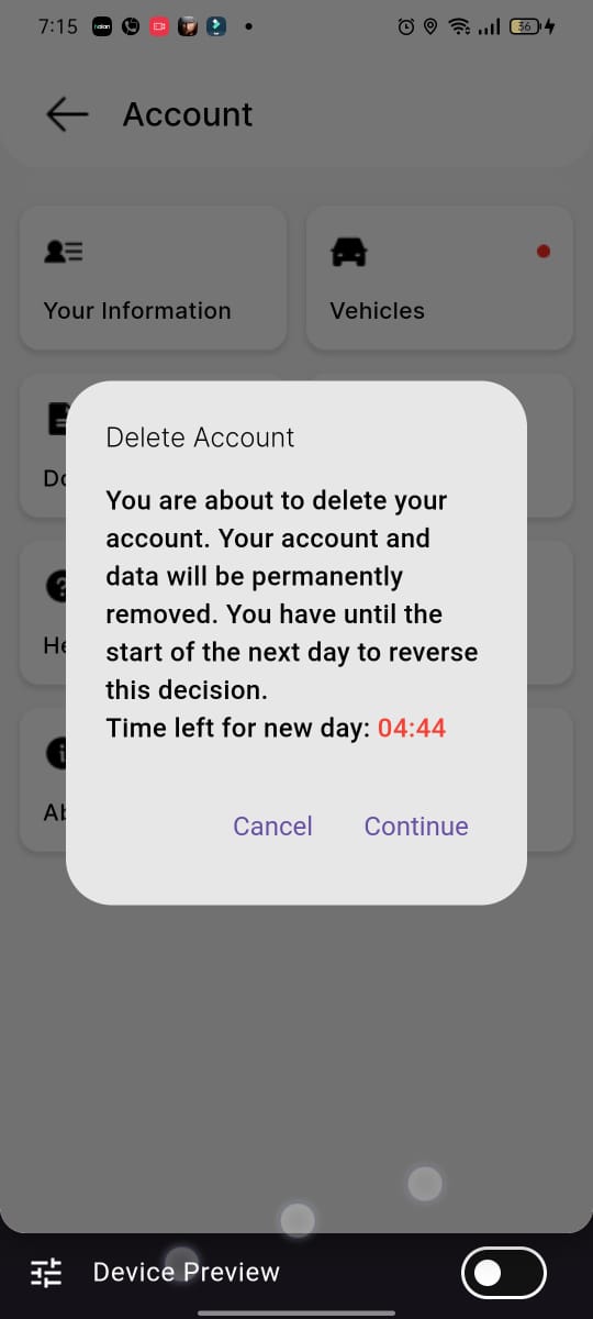 Confirmation screen will appear, explaining what happens when you delete your account. You will lose all your data, including ride history, preferences, and saved information.